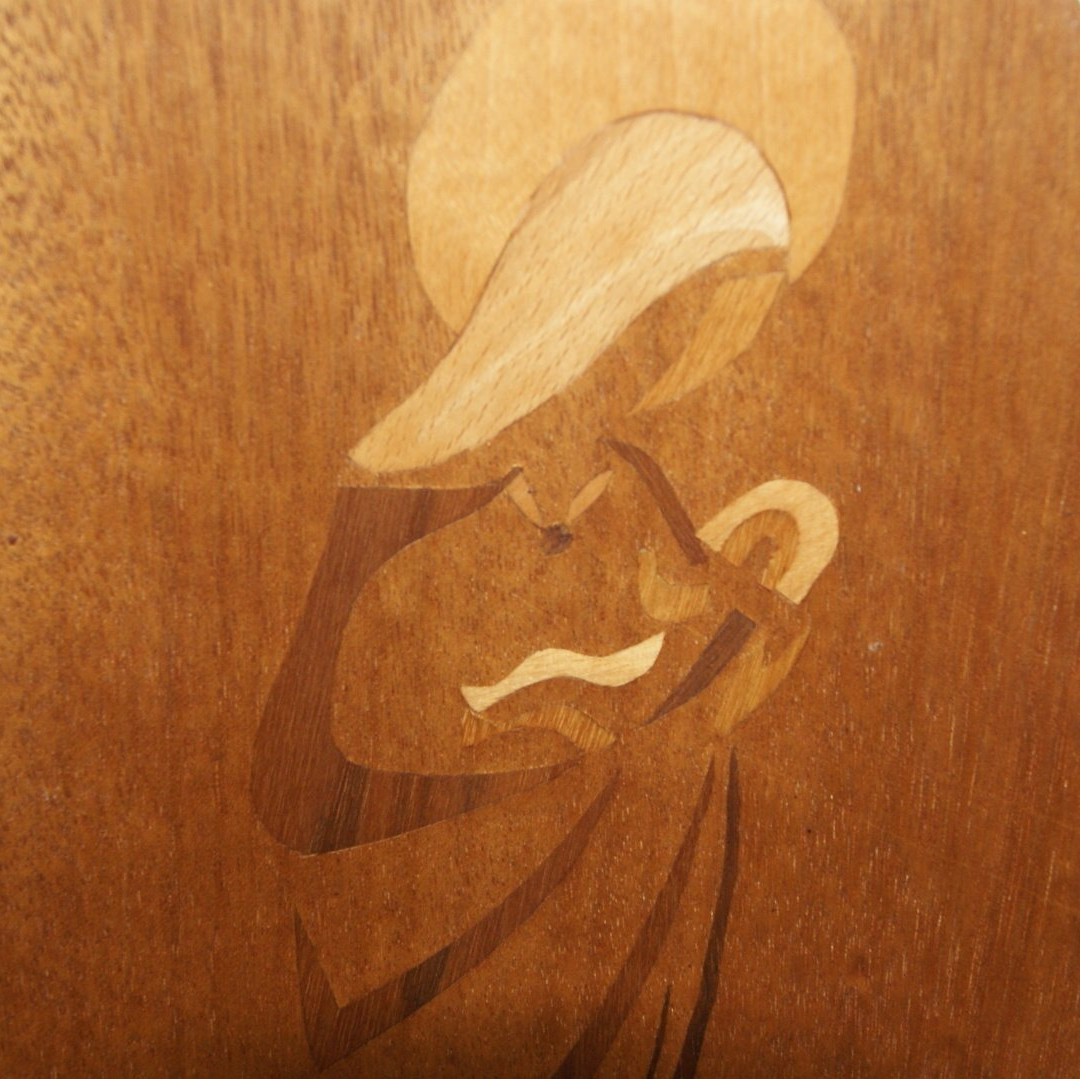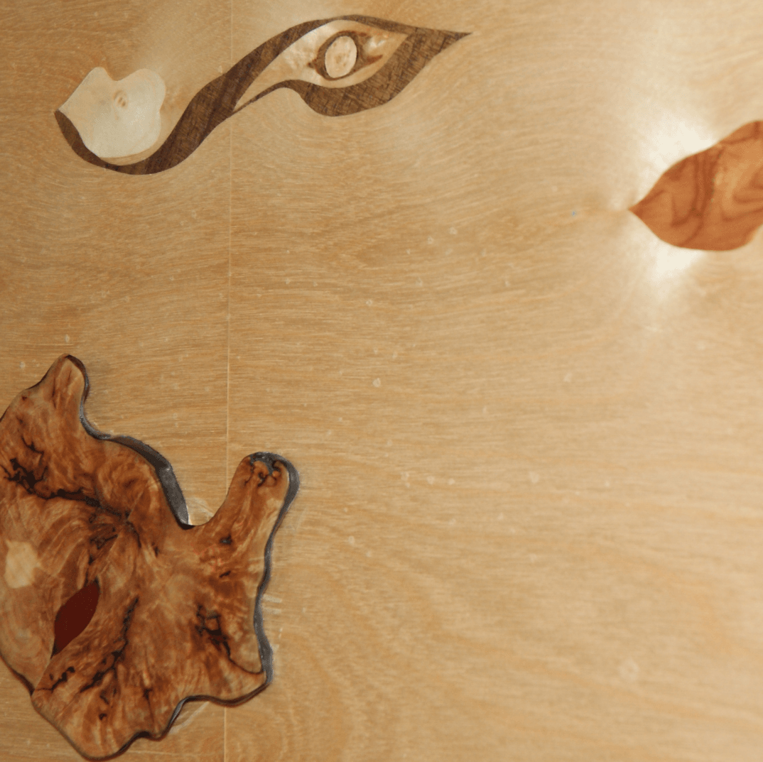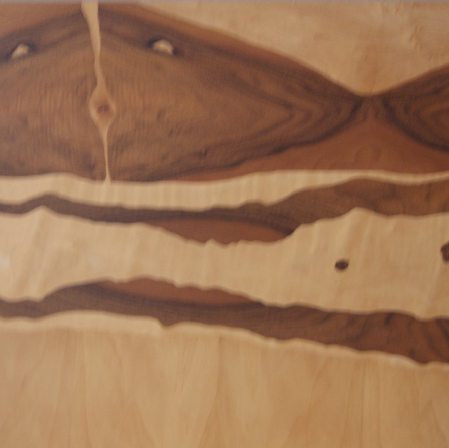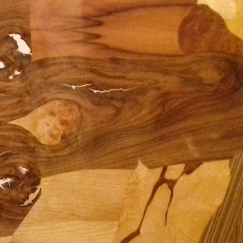 Hochglanz lackiert, astiges Nußholz, gepaart mit anderen Hölzern