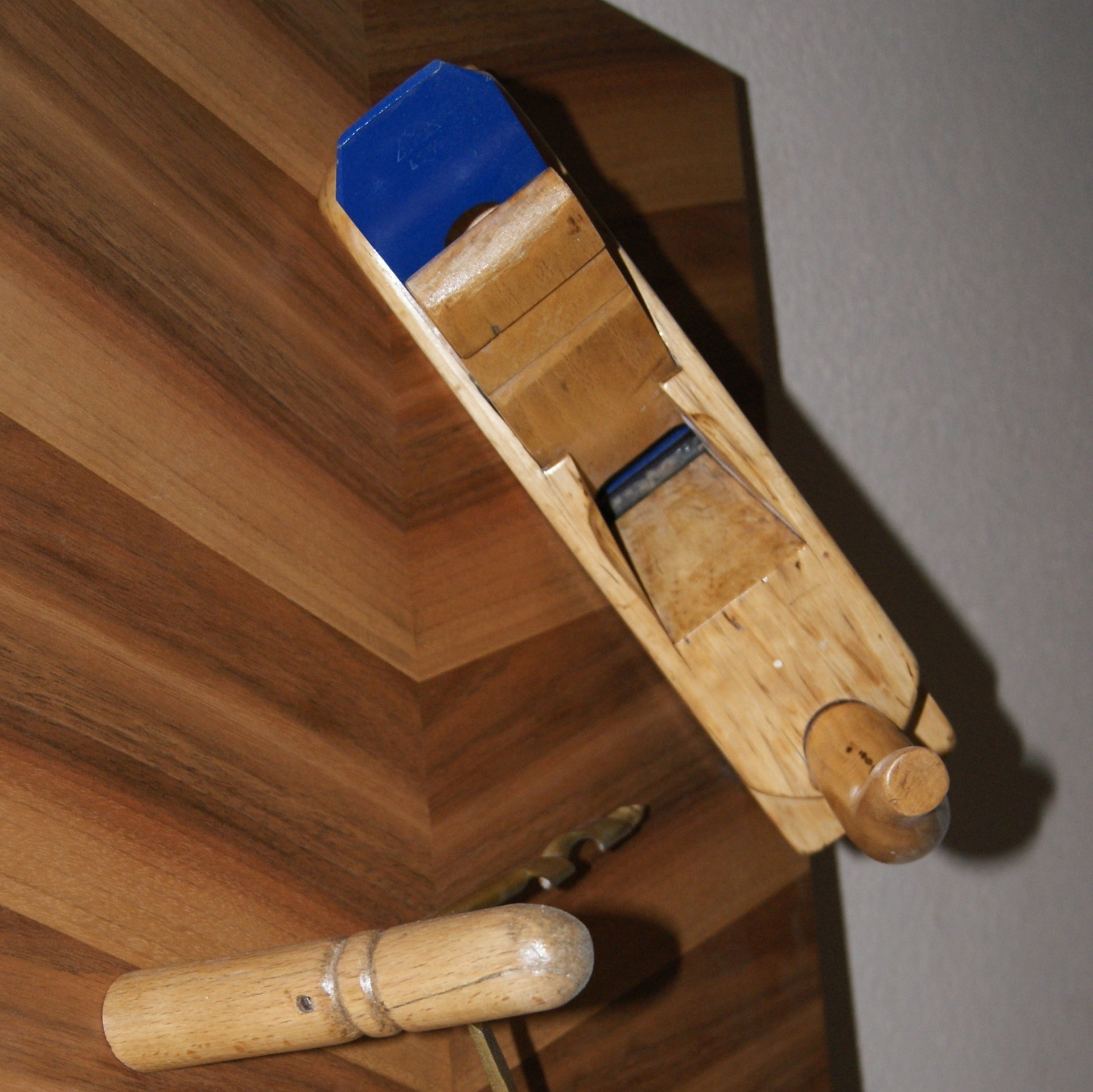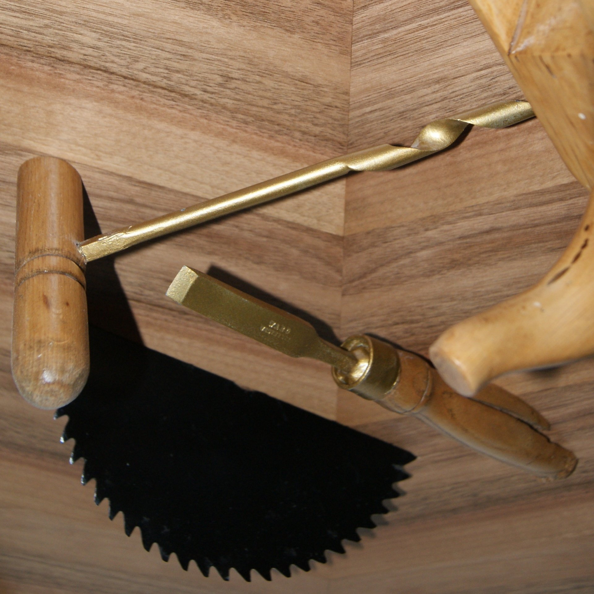 mit altem Werkzeug, Nuß Hintergrund mit Hobel, Bohrer, Stemmeisen und Kreissägenblatt